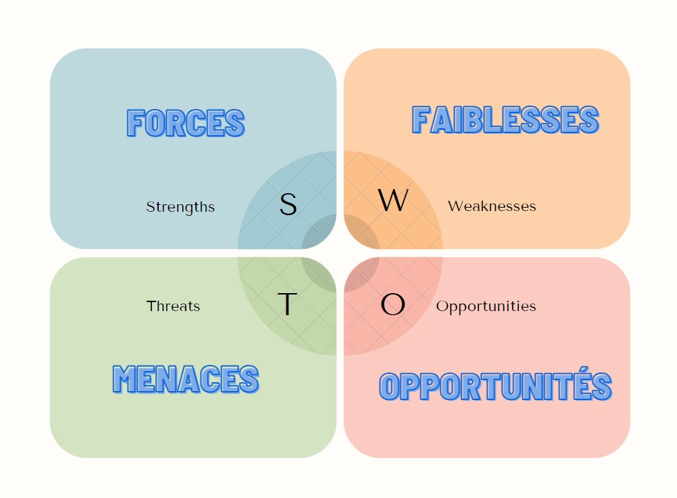 Cette méthode d’analyse permet d’évaluer la position stratégique d’une entreprise ou d’un projet en examinant ces quatre aspects clés. Il s’agit d’un cadre de réflexion stratégique qui aide à identifier les facteurs internes et externes pouvant influencer le succès d’un projet ou d’une organisation.