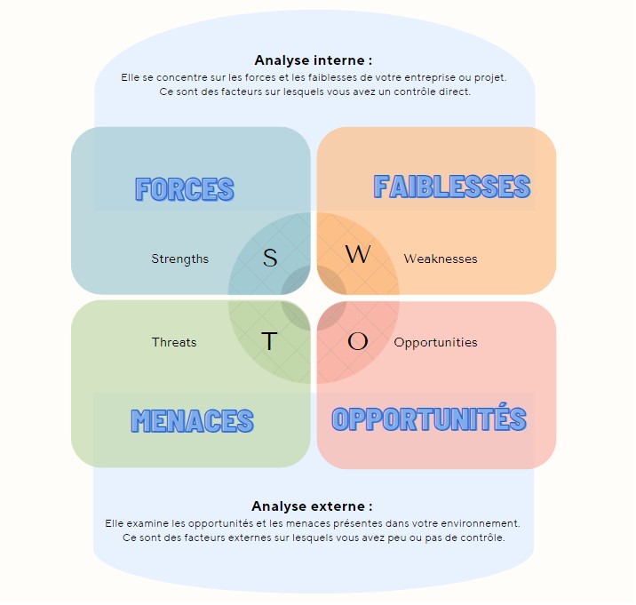 - Analyse interne : Elle se concentre sur les forces et les faiblesses de votre entreprise ou projet. Ce sont des facteurs sur lesquels vous avez un contrôle direct.